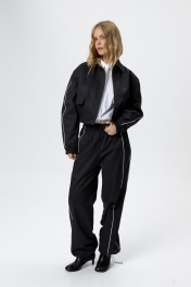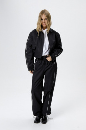 Укороченная спортивная куртка-бомбер с кантами. Детали: прямой силуэт, воротник, пояс переда и спинки на резинке, застежка на молнию, рукава длинные, функциональные карманы, спинка со средним швом, куртка на подкладке. Длина куртки по спинке с поясом около 49 см в размерах 40-46 и около 50,5 см в размерах 48-52, длина рукава около 60 см+ спуск плеча около 2 см