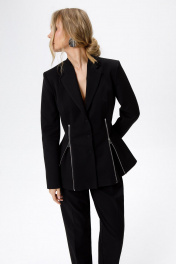 Костюм-двойка из приталенного жакета с молниями и укороченных классических брюк со стрелками.