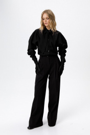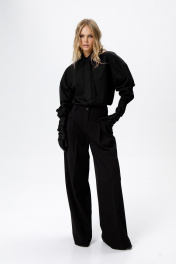 Брюки-палаццо со складками. Детали: широкие брюки-палаццо с небольшими складками у пояса и заутюженными стрелками, притачной пояс со шлевками, застежка на молнию и пуговицу, боковые карманы. Задние части брюк с вытачками и имитацией карманов.