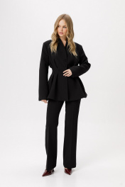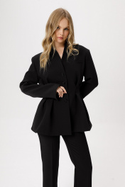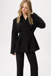 Приталенный жакет со складками и расширенными плечами. Детали: полуприлегающий силуэт с расширенными плечами, цельнокроеный воротник-стойка, застежка на петли и пуговицы, рукава втачные двушхшовные, жакет на подкладке Длина по спинке около 66 см в размерах 40-46 и около 67,5 см в размерах 48-52, длина рукава около 61 см