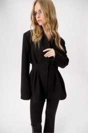 Приталенный жакет со складками и расширенными плечами из фактурной ткани «букле». Детали: полуприлегающий силуэт с расширенными плечами, цельнокроеный воротник-стойка, застежка на петли и пуговицы, рукава втачные двушхшовные, жакет на подкладке Длина по спинке около 66 см в размерах 40-46 и около 67,5 см в размерах 48-52, длина рукава около 61 см