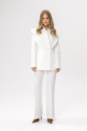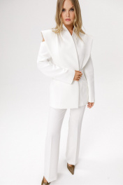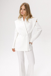 Приталенный двубортный жакет. Детали: полуприлегающий силуэт, цельнокроеный воротник-стойка, двубортная застёжка на петли и пуговицы, рельефные швы переда и спинки с декоративным элементом, рукава длинные с вырезами по верху, функциональные карманы, жакет на подкладке. Длина изделия по спинке в размерах 40-46 около 71 см, в размерах 48-52 около 74 см, длина рукава около 61 см. Приобрести брюки с фото можно по арт. 6343