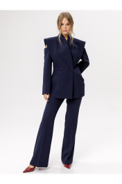 Приталенный двубортный жакет. Детали: полуприлегающий силуэт, цельнокроеный воротник-стойка, двубортная застёжка на петли и пуговицы, рельефные швы переда и спинки с декоративным элементом, рукава длинные с вырезами по верху, функциональные карманы, жакет на подкладке. Длина изделия по спинке в размерах 40-46 около 71 см, в размерах 48-52 около 74 см, длина рукава около 61 см. Приобрести брюки с фото можно по арт. 6343