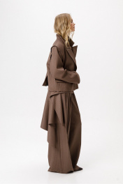 Костюм-двойка из укороченного оверсайз жакета с необработанным краем пройм и широких брюк-палаццо из текстильной ткани в полоску. Детали: жакет прямого силуэта, пиджачный воротник, двубортная застежка на две петли и пуговицы, функциональные карманы, спинка с фигурной кокеткой, рукава втачные, жакет на подкладке. Брюки с притачным поясом со шлевками, складки у пояса, застежка на молнию и пуговицу, боковые карманы, заутюженные стрелки. Задние части брюк с вытачками и имитацией карманов. Длина жакета по спинке около 55 см в размерах 40-46 и около 56,5 см в размерах 48-52, длина рукавов около 61 см. Длина брюк по боковому шву с поясом около 109,5 см, длина по внутреннему шву около 83 см