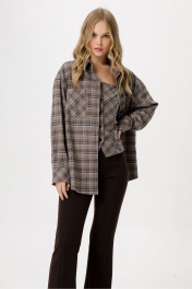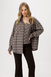 Комплект-двойка из текстильной оверсайз рубашки в клетку и трикотажных облегающих брюк-клеш. Детали: прямой силуэт, свободный покрой, рубашечный воротник, застежка на петли и пуговицы, перед с накладными карманами, спинка с кокеткой, рукава длинные с манжетами. Брюки с высокой посадкой, перед с рельефными швами, пояс с резинкой, брюки без карманов. Длина рубашки по спинке около 69 в размерах 40-46 и около 71см в размерах 48-52, длина рукавов со спущенным плечом около 62+9 см. Длина брюк по боковому шву с поясом около 107 см, по внутреннему шву около 79,5 см