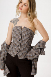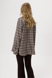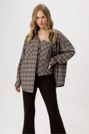Комплект-тройка из текстильной оверсайз рубашки, топа-корсета в клетку и трикотажных облегающих брюк-клеш. Детали: прямой силуэт, свободный покрой, рубашечный воротник, застежка на петли и пуговицы, перед с накладными карманами, спинка с кокеткой, рукава длинные с манжетами. Топ прилегающего силуэта, рельефные швы с регилином, застежка по переду на петли и пуговицы, спинка с эластичной вставкой, фигурный низ. Брюки с высокой посадкой, перед с рельефными швами, пояс с резинкой, брюки без карманов. Длина рубашки по спинке около 69 в размерах 40-46 и около 71см в размерах 48-52, длина рукавов со спущенным плечом около 62+9 см. Длина топа по спинке около 27,5 см в размерах 40-46 и около 29 см в размерах 48-52. Длина брюк по боковому шву с поясом около 107 см, по внутреннему шву около 79,5 см