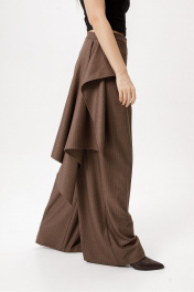 Костюм-тройка из укороченного оверсайз жакета с необработанными проймами, широких брюк-палаццо и съемной юбки-баски килт из текстильной ткани в полоску. Детали: жакет прямого силуэта, пиджачный воротник, двубортная застежка на две петли и пуговицы, функциональные карманы, спинка с фигурной кокеткой, рукава втачные, жакет на подкладке. Брюки с притачным поясом со шлевками, складки у пояса, застежка на молнию и пуговицу, боковые карманы, заутюженные стрелки. Задние части брюк с вытачками и имитацией карманов. Баска с притачным поясом с застежкой на петлю и пуговицу. Длина жакета по спинке около 55 см в размерах 40-46 и около 56,5 см в размерах 48-52, длина рукавов около 61 см. Длина брюк по боковому шву с поясом около 109,5 см, длина по внутреннему шву около 83 см