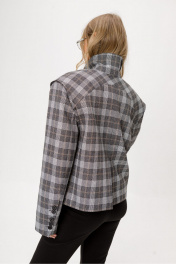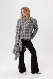 Комплект-двойка из укороченного оверсайз жакета в клетку с необработанными проймами и трикотажных облегающих брюк-клеш. Детали: жакет прямого силуэта, пиджачный воротник, двубортная застежка на две петли и пуговицы, функциональные карманы, спинка с фигурной кокеткой, рукава втачные, жакет на подкладке. Брюки с высокой посадкой, перед с рельефными швами, пояс с резинкой, брюки без карманов. Длина по спинке около 55 в размерах 40-46 и около 56,5 см в размерах 48-52, длина рукавов около 61 см. Длина брюк по боковому шву с поясом около 107 см, по внутреннему шву около 79,5 см