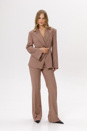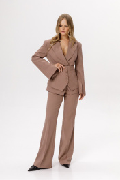 Комплект-двойка из приталенного жакета с разрезами по рукавам и съёмной баски (приобрести брюки с фото можно по арт. 6343, приобрести жакет с фото без баски 6539). Детали: полуприлегающий силуэт, втачные двухшовные рукава, смещённая застёжка на одну петлю и пуговицу. Баска приталенная, рельефные швы, функциональные карманы, центральная застёжка на петли и пуговицы, хлястик-регулятор по спинке. Длина жакета по спинке около 65 см в размерах 40-46, около 68 см в размерах 48-52, длина рукава около 62 см. Длина баски около 22,5 см в размерах 40-52.