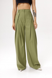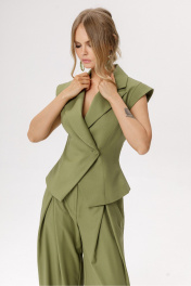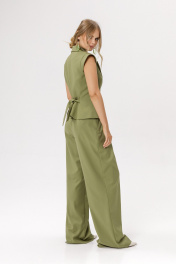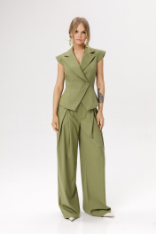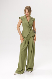 Костюм-двойка из приталенного жилета с фигурным бортом и брюк-палаццо со складками и высокой посадкой. Детали: полуприлегающий силуэт жилета, рельефные швы переда, смещённая застёжка на одну пуговицу, спинка со средним швом и талиевыми вытачками, рукав-«крыло», пиджачный воротник, хлястик-завязка по спинке, жилет на подкладке. Широкие брюки с притачным поясом со шлёвками, задняя часть пояса на резинке, карманы в боковых швах, застёжка на молнию и пуговицу, задняя часть брюк с вытачками. Длина жилета по спинке около 55 см в размерах 40-46 и около 58 см в размерах 48-52. Длина брюк по боковому шву с поясом около 114 см в размерах 40-46 и около 115 см в размерах 48-52. Длина по внутреннему шву около 81 см