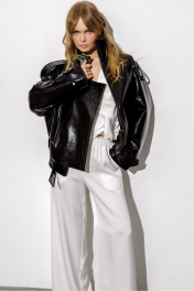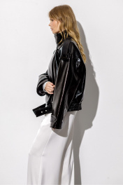 Куртка оверсайз из лакированной экокожи. Детали: прямой силуэт, воротник-стойка, спущенная линия плеч, пояс переда и спинки на резинке, застежка на молнию и кнопки, рукава длинные с патами по низу, функциональные карманы, спинка с двумя глубокими складками, куртка на подкладке. Длина по спинке с поясом около 58 см в размерах 40-46 и около 60 см в размерах 48-52, длина рукава+ расширенное плечо около 57+ 8 см