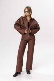 Оверсайз бомбер из хлопкового джинса (приобрести брюки с фото можно по арт. 6576). Детали: бомбер О-силуэта, свободный покрой и расширеные плечи, перед с кокеткой, стояче-отложной воротник, застёжка на молнию и металлические пуговицы, функциональные карманы, погоны, бомбер на подкладке. Длина по спинке около 54 см в размерах 40-46, около 59 см в 48-52, длина рукава с плечом около 73 см. Длина брюк по боковому шву с поясом около 104 см в размерах 40-46, около 105,5 см в 48-52, длина по внутреннему шву около 75 см