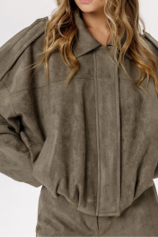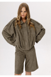 Оверсайз бомбер из замши со спущенными плечами и складками по низу (приобрести шорты-бермуды с фото можно по арт. 6593). Детали: О-силуэт, кокетка по переду, расширенное плечо, стояче-отложной воротник с цельнокроенной стойкой, застёжка на молнию, функциональные карманы, погоны на рукавах, бомбер на подкладке. Длина по спинке около 54 см в размерах 40-46, около 59 см в 48-52, длина рукава около 73 см.