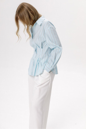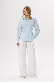 Комплект-двойка из приталенной рубашки из хлопка и брюк-палаццо. Детали: полуприлегающий силуэт, удлинённое плечо, застроченные складки по талии переда и спинки, рубашечный воротник, застёжка на петли и пуговицы, длинные рукава с притачными манжетами, фигурный низ. Широкие брюки-палаццо с небольшими складками у пояса и заутюженными стрелками, притачной пояс со шлевками, застежка на молнию и пуговицу, боковые карманы. Задние части брюк с вытачками и имитацией карманов. Длина рубашки по спинке около 66 см в размерах 40-46, около 69 см в размерах 48-52, длина рукава + плечо около 55+20 см в размерах 40-46 и около 55+21 см в размерах 48-52. Длина брюк по боковому шву с поясом около 109,5 см, длина по внутреннему шву около 83 см