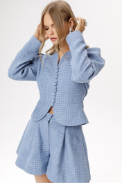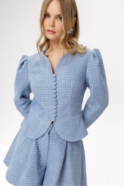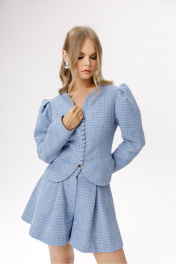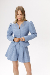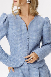 Укороченный жакет из фактурной ткани (приобрести шорты с фото можно по арт. 6625). Детали: полуприлегающий силуэт, рельевные швы переда, подрезы по талии, фигурная горловина, спинка отрезная со средним швом и талиевыми вытачками, рукав двухшовный с бантовыми складками по окату, застёжка центральная на навесные петли и пуговицы, жакет на подкладке. Длина по спинке около 52 см в размерах 40-46, около 56 см в размерах 48-52, длина рукава около 62 см.