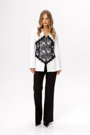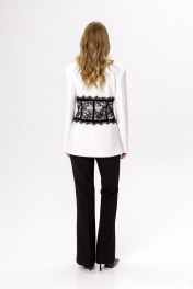 Приталенный жакет с контрастным кружевом по талии (приобрести брюки с фото можно по арт. 6343). Детали: полуприлегающий силуэт, V-образный вырез горловины, талиевые вытачки переда и спинки, спинка со средним швом, втачные двухшовные рукава, застёжка на навесные петли и пуговицы, отделка кружевом и бархатной лентой, жакет на подкладке. Длина жакета по спинке около 72 см в размерах 40-46, около 75 см в размерах 48-52, длина рукава около 62 см.