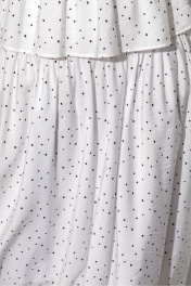 Комплект-двойка из приталенной блузы без рукавов и макси-юбки в горошек. Детали: блуза прилегающего силуэта, нагрудные вытачки, глубокий V-образный вырез, широкий пояс по переду и спинке, баска со сборкой, застёжка на потайную молнию и завязку по спинке, блуза на подкладке. Юбка с широкой кокеткой, потайная молния в боковом шве, юбка на хлопковой подкладке. Длина блузы по спинке от плеча около 61 см в размерах 40-46 и около 64 см в размерах 48-52. Длина юбки по боковому шву около 98 см