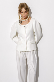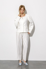 Свободные брюки со складками из текстильной ткани (приобрести жакет с фото можно по арт. 6702). Детали: высокая посадка, притачной пояс, застежка на молнию и потайной крючок, боковые карманы, передние половины с двумя складками, задние половины брюк с двумя вытачками и накладными карманами. Пояс брюк без резинки. Длина брюк по боковому шву с поясом около 100 см, длина по внутреннему шву около 71 см