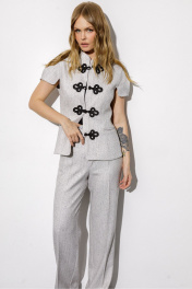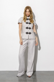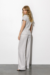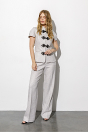 Широкие прямые брюки с рисунком «ёлочка» (приобрести жакет с фото можно по арт. 6728, 6804). Детали: брюки с притачным поясом со шлевками, передние половины с небольшими застроченными мягкими складками и заутюженными стрелками, застежка на молнию и пуговицу, боковые карманы. Задние части брюк с вытачками и заутюженными стрелками. Пояс брюк прямой, без резинки. Длина по боковому шву с поясом около 114 см в размерах 40-46 и около 115,5 см в размерах 48-52. Длина по внутреннему шву около 83 см