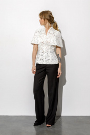 Кружевная блуза-кейп приталенного силуэта и цельнокроеной пелериной. Детали: прилегающий силуэт, талиевые вытачки по переду и спинке, цельнокроеная горловина стойка, потайная молния в среднем шве спинки, подкладка- 100% хлопок. Длина по спинке около 62 см в размерах 40-46, около 65 см в 48-52