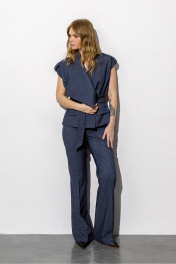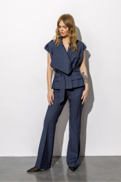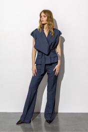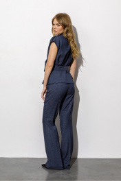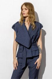 Приталенный жилет с асимметричным воротником из текстильной ткани под джинс (приобрести брюки с фото можно по арт. 6744). Детали: жилет приталенного силуэта, асимметричный воротник-шаль, отрезная линия талии со складками, спущенное плечо, функциональные карманы, застежка на петли и пуговицы, съемный пояс, жилет на подкладке. Длина по спинке около 57 см в размерах 40-46 и около 60 см в размерах 48-52
