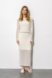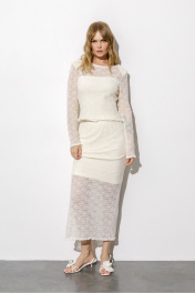 Комплект-двойка из облегающего лонгслива ажурной вязки и базового топа на бретелях (приобрести юбку с фото можно по арт. 6770). Детали: джемпер приталенного силуэта, углубленная горловина спинки, рукава втачные длинные, плечевые накладки, оборки. Прилегающий укороченный топ на бретелях из гладкого трикотажа.