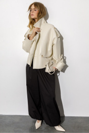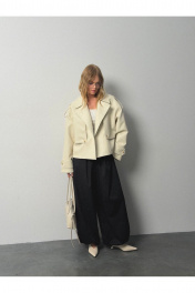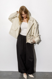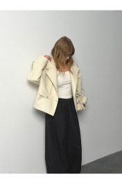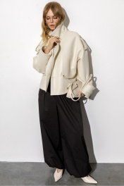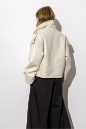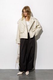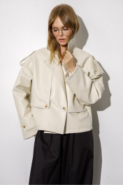 Тренчкот из экокожи свободного силуэта. Детали: спущенная линия плеч, отлетные кокетки переда, застежка на петли и пуговицы, спинка со средним швом, длинные рукава с широкими патами, тренчкот на подкладке. Длина по спинке около 54,5 см в размерах 40-46 и около 57 см в размерах 48-52, длина рукава+ плечо около 52+10 см