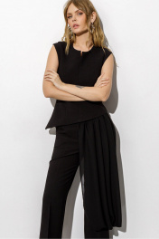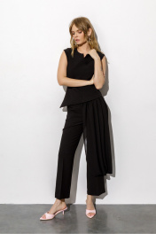 Костюм-двойка из асимметричной приталенной блузы и укороченных брюк-клёш со стрелками. Детали: блуза прилегающего силуэта, рельефные швы, застежка на потайную молнию по спинке, на подкладке. Брюки клёш с притачным поясом со шлёвками, передние половины с заутюженными стрелками, застёжка на молнию и потайной крючок, наклонные карманы в боковых швах, задние половины брюк с вытачками и заутюженными стрелками. Пояс брюк без резинки. Длина брюк по боковому шву с поясом около 96 см в размерах 40-46 и около 98 см в размерах 48-52. Длина по внутреннему шву около 67 см