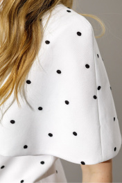 Костюм-двойка из приталенной блузы-кейпа с цельнокроеной пелериной и широких брюк-алладинов из вискозы в горохи. Детали: блуза прилегающего силуэта, талиевые вытачки по переду и спинке, цельнокроеная горловина стойка, потайная молния в среднем шве спинки, блуза на подкладке. Брюки с высокой посадкой на притачном эластичном поясе, без застежки, боковые карманы, низ брюк с эластичными манжетами, брюки на хлопковой подкладке. Длина блузы по спинке около 62 см в размерах 40-46, около 65 см в 48-52. Длина брюк по боковому шву с поясом около 108 см, длина по внутреннему шву около 75 см