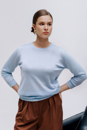 Джемпер женский второго слоя одежды. С втачным рукавом длиной 3/4. Круглый вырез горловины обработан бейкой сдвоенная кулирная гладь высотой в готовом виде 1,8 ± 0,2 см.. Низ станов и рукавов заработан ластиком 1х1 высотой в готовом виде 5,5 ± 0,5 см. -стан; 6,0 ± 0,5 см -рукав. По краю бейки и низу рукава проложена высокорастяжимая полушерстяная пряжа "Новинка" 110 Текс.