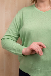 Джемпер второго слоя одежды с длиным втачным рукавом.V вырез горловины закеттлеван -сдвоенной кулирной гладью высотой в гот. виде 1,5+0,2. По краю бейки проложена "Новинка" 110.Низ изделия и рукавов заработан ластиком 1х1 высотой в гот. виде 6,5+-0,5см. По краю низа рукава проложена "Новинка" 110т