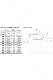 Свитер незначительно заужен книзу с длинным рукавом. Круглый вырез горловины обработан двойным воротником стойкой, высотой в готовом виде 6,5см+-0,5. Низ стана и рукавов заработан ластиком 1х1