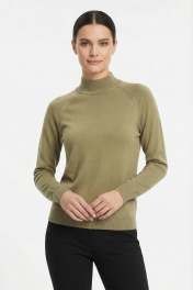Свитер прямого силуэта с длинным рукаом "реглан". Низ изделия и рукавов заработан ластиком 1х1. Воротник - двойная ластичная стойка