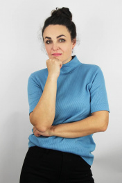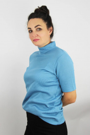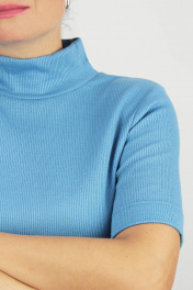 Свитер женский,второго слоя одежды, с втачным коротким рукавом.Круглый вырез горловины обработан притачным воротником стойка высотой в г.в 7,0см +-0,5см Низ изделия и рукава обработаны подгибом шириной 4.0 см