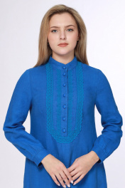 Удачный дуэт простоты и элегантности, натуральность, отличные эксплуатационные характеристики уже который век делают платья из льна любимым предметом гардероба модниц всех возрастов. Свободный силуэт-трапеция. На спинке от кокетки бантовая складка, боковые разрезы.Рукав длинный, втачной, с локтевой вытачкой. Карманы расположены в боковых швах. Платье декорировано кружевом в два ряда из натуральной льняной ткани, вываренное по специальной технологии. Застегивается на пуговицы. Цвет Ультрамарин чрезвычайно притягательный и загадочный цвет, изысканный, интенсивный, свежий. Такой оттенок отождествляет собой постоянство, ум, серьезность взглядов. Он жизнерадостный и сегодня достаточно популярный, его можно встретить в самых различных областях нашей жизни, но все-таки наиболее популярен этот цвет в одежде. Этот глубокий яркий оттенок синего уже не один сезон удерживается на вершине модного Олимпа.