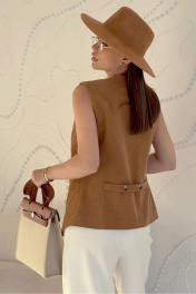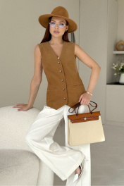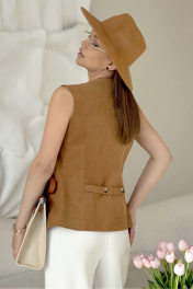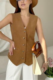 Жилетка женская из текстильной ткани (вельвет-штрукс) на подкладке. По переду расположены нагрудные вытачки, прорезные карманы в "рамку". Спинка с рельефами. По линии талии вставлен хлястик. Застежка на петлях-пуговицах. Вырез горловины V-образный. Промеры на примере 42 р.: Длина изделия по спинке 57 см. ОГ - 88 см, ОТ - 84 см, ОБ - 92 см. Рост модели на фото 170 см.