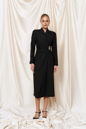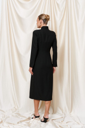 Платье полуприлегающего силуэта, длиной миди, из плательно-костюмной ткани. По переду сборка от плечевого шва, правый край борта с защипами в области талии, по левой детали переда талиевая вытачка. По спинки средний шов, талиевые вытачки, кокетка. Цельнокроеная стойка, застежка от защипов по переду на навесные петли и пуговицы. Рукава трехшовные, реглан. На подкладке.