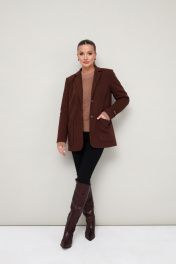 Стильный жакет полуприлегающего силуэта, выполнен из костюмной ткани. Воротник пиджачного типа с отложными лацканами. Застежка центральная на петли и пуговицы. Спереди обработаны накладные карманы, в области груди подрезы с нагрудными вытачками. Спинка с рельефами и средним швом, переходящим в шлицу. Рукава втачные двухшовные, на левом рукаве декоративная нашивка. Изделие на подкладке.