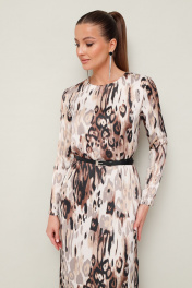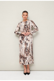 Платье прямого силуэта в длине миди, выполнено из струящейся ткани с благородным матовым блеском и актуальным абстрактным дизайном. Округлый вырез горловины. Рукава длинные втачные. Застежка по спинке в среднем шве «капля» на пуговицу и навесную петлю. По низу в боковых швах обработаны высокие разрезы.