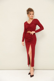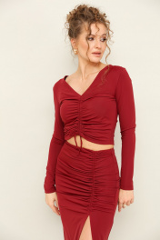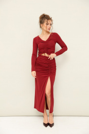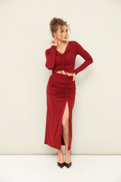 Комплект состоит из топа и юбки, выполнен из качественного бифлекса, эластичного, приятного к телу. Юбка с глубоким вырезом спереди, с кулисой, регулирующая уровнь натяжения и длина изделия. Топ также с кулисой, длину которого можно регулировать и может получиться полноценный джемпер, прикрывающий живот.