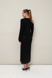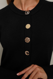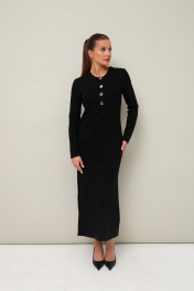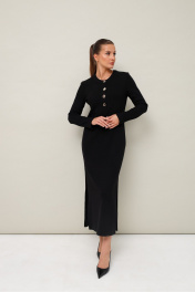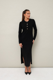 Стильное платье полуприлегающего силуэта, выполнено из трикотажного полотна. Горловина округлой формы, с центральной застежкой на петли и 4 разных пуговицы. Рукава длинные втачные. В боковых швах обработаны высокие разрезы.