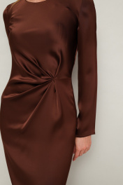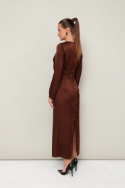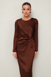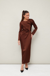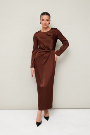 Вечернее платье полуприлегающего силуэта, выполнено из струящейся ткани с благородным матовым блеском. Горловина округлой формы. В области талии заложены складки, плавно переходящие в драпировку. Рукава втачные длинные. Застежка в среднем шве спинки на тесьму молнию. Для удобства движения сзади обработан разрез.