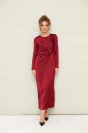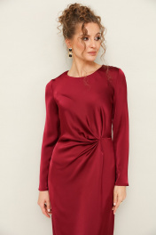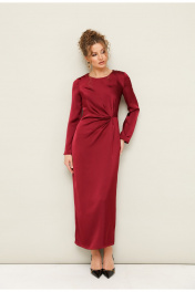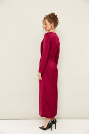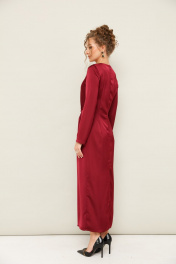 Вечернее платье полуприлегающего силуэта, выполнено из струящейся ткани с благородным матовым блеском. Горловина округлой формы. В области талии заложены складки, плавно переходящие в драпировку. Рукава втачные длинные. Застежка в среднем шве спинки на тесьму молнию. Для удобства движения сзади обработан разрез