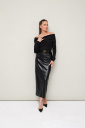 Блуза с открытыми плечами прилегающего силуэта, выполнен из эластичного полотна - бифлекс. По верхнему срезу обработан широкий отворот. Рукава втачные длинные.