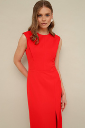Лаконичное платье прилегающего силуэта, отрезное по талии, выполнено из плательной ткани. Округлый вырез горловины. Лиф по переду и спинке с конструктивными складками в рельефах. Юбка с высоким разрезом по левой стороне. Застежка в среднем шве спинки на потайную молнию. Платье обработано подкладкой.