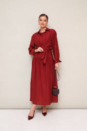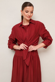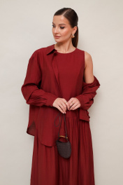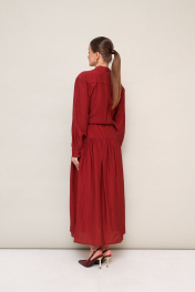 Элегантный 2-предметный комплект, состоящий из платья и блузки. Платье отрезное ниже линии талии. Округлый вырез горловины. Лиф с рельефными швами, спинка с центральной застежкой на потайную молнию. Юбка с легкой сборкой по шву притачивания. Платье на хлопковой подкладке. Блузка прямого кроя, горловина с рубашечным воротником со стойкой. Застежка центральная на петли и пуговицы. Спущенная линия втачивая рукава, манжеты с застежкой на пуговицы. В боковых швах обработаны фигурные разрезы. Спинка с отрезной кокеткой и встречной складкой.