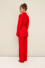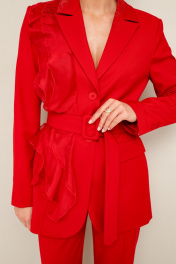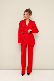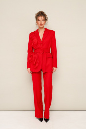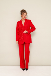 Комплект 2-предметный, состоящий из жакета и брюк, выполненный из костюмной ткани. Жакет полуприлегающего силуэта, с центральной застежкой на петли и пуговицы. Воротник пиджачного типа с отложными лацканами, край борта скругленный по низу жакета. Спереди прорезной карман в рамку с клапаном. По правой полочке обработан декоративный элемент в виде настрочных воланов. Рукава втачные, двухшовные с вытачными шлицами с пуговицами. Спинка с рельефами и средним швом, переходящим в шлицу. Жакет на подкладке. Брюки классического кроя с заутюженными стрелками и с боковыми наклонными карманами. Пояс притачной с застежкой на пуговицу и тесьму-молнию, сзади на резинке, для регуляции размера.