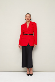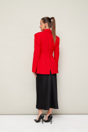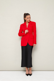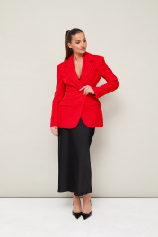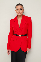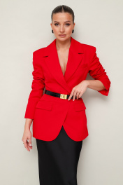 Стильный 2-предметный комплект, состоящий из жакета и юбки. Силуэтный жакет с подчеркнутой линией талии. Смещенная застежка на петлю и пуговицу. Воротник пиджачного типа с отложными лацканами, край борта скругленный по низу жакета. Спереди обработаны прорезные карманы в рамку с клапанами и нагрудный прорезной карман с листочкой. Рукава втачные, двухшовные с отлетнымм шлицами. Спинка с рельефами и средним швом, переходящим в шлицу. Жакет на подкладке. Юбка с кроем «по косой» в длине миди, пояс на обтачке, застежка в боковом шве на потайную тесьму молнию.В комплекте прилогается ремень с акцентной пряжкой .