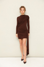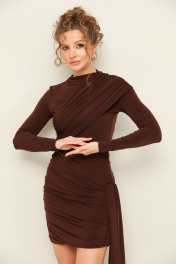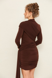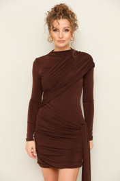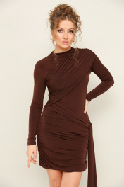 Платье прилегающего силуэта в длине мини, выполнено из эластичной ткани - масло. Горловина с цельнокроеной стойкой. Рукава длинные втачные. Перед и спинка декорированы диагональными деталями со сборкой в области лифа и бедер. В комплекте прилагается акцентная съемная деталь, которая придает платью особую элегантность.