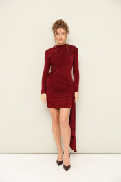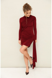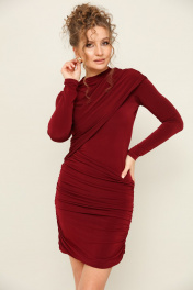 Платье прилегающего силуэта в длине мини, выполнено из эластичной ткани - масло. Горловина с цельнокроеной стойкой. Рукава длинные втачные. Перед и спинка декорированы диагональными деталями со сборкой в области лифа и бедер. В комплекте прилагается акцентная съемная деталь, которая придает платью особую элегантность.